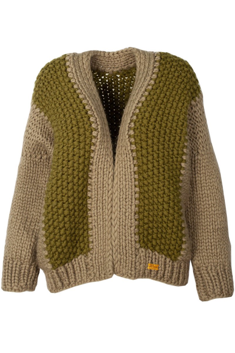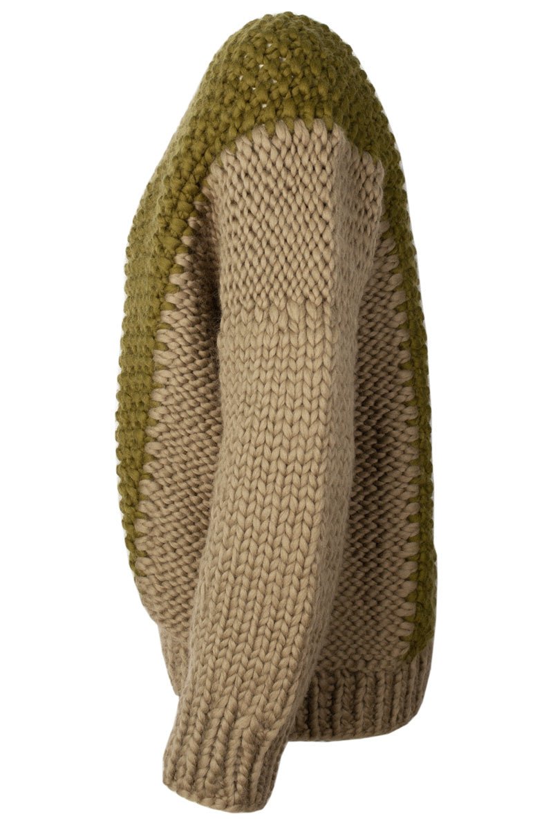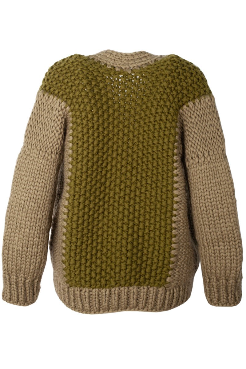 This hand knitted merino wool ladies cardigan is on of our more elaborate pieces, featuring geometrical color blocking and structured in such a way that it is as seamless and comfortable as possible. It can easily be worn as a jacket, and paired with a wide range of outfits.