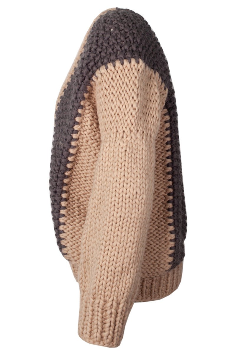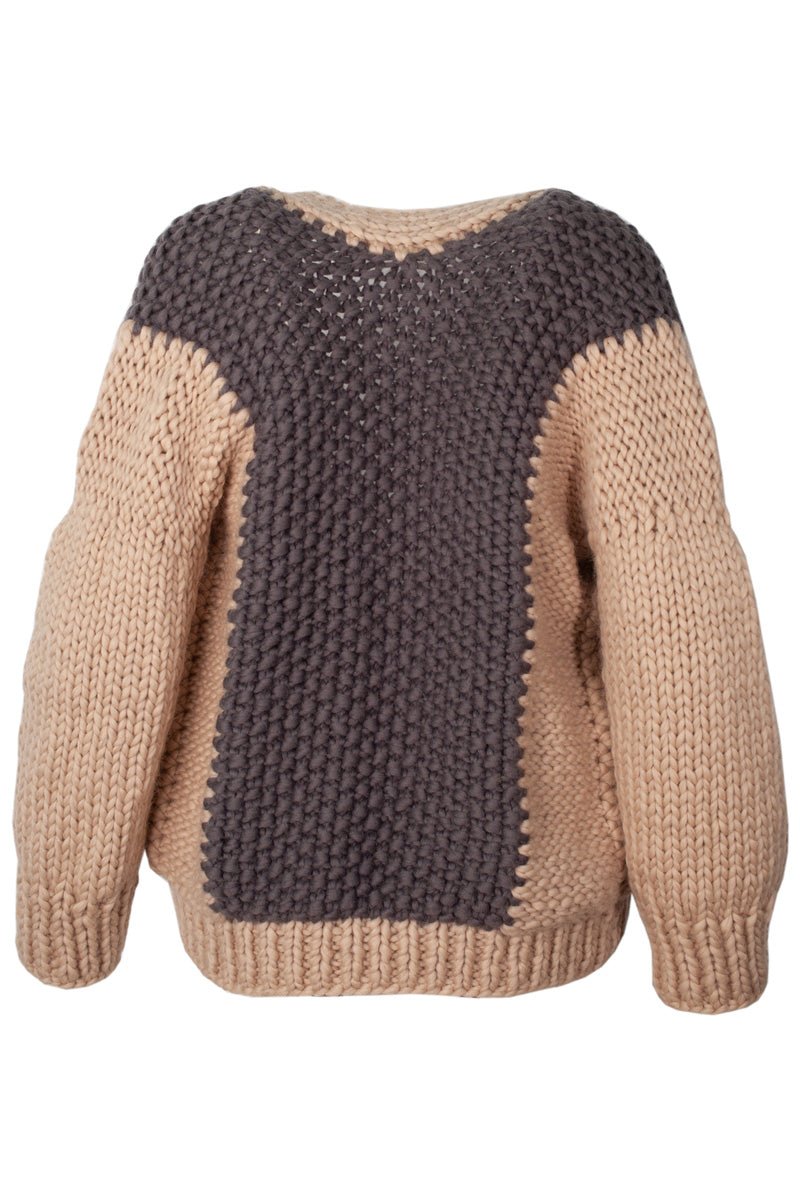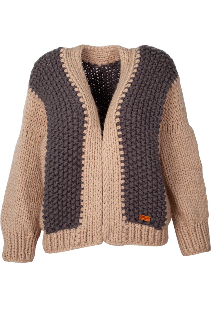 This hand knitted merino wool ladies cardigan is on of our more elaborate pieces, featuring geometrical color blocking and structured in such a way that it is as seamless and comfortable as possible. It can easily be worn as a jacket, and paired with a wide range of outfits.