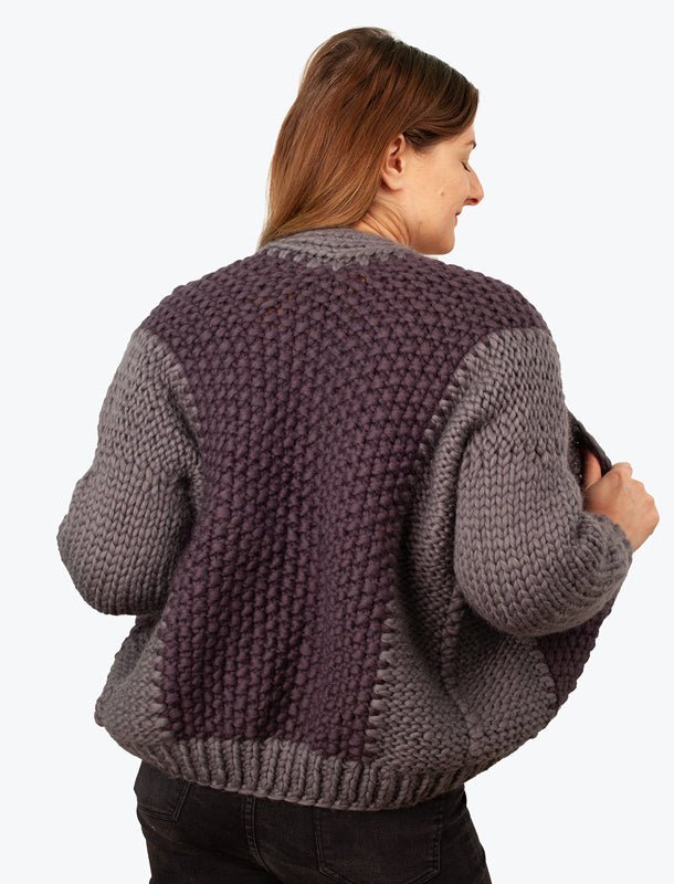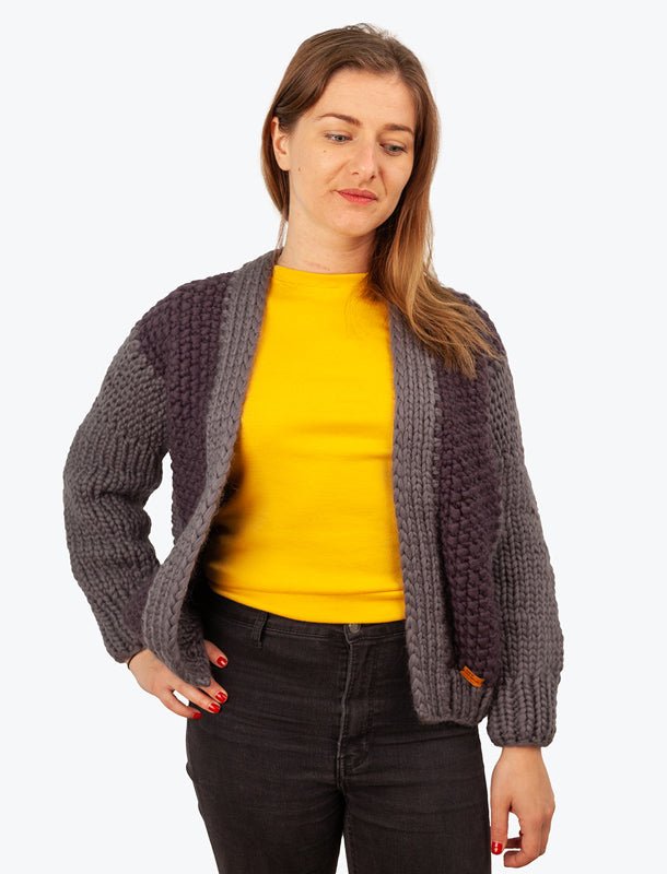 This hand knitted merino wool ladies cardigan is on of our more elaborate pieces, featuring geometrical color blocking and structured in such a way that it is as seamless and comfortable as possible. It can easily be worn as a jacket, and paired with a wide range of outfits.