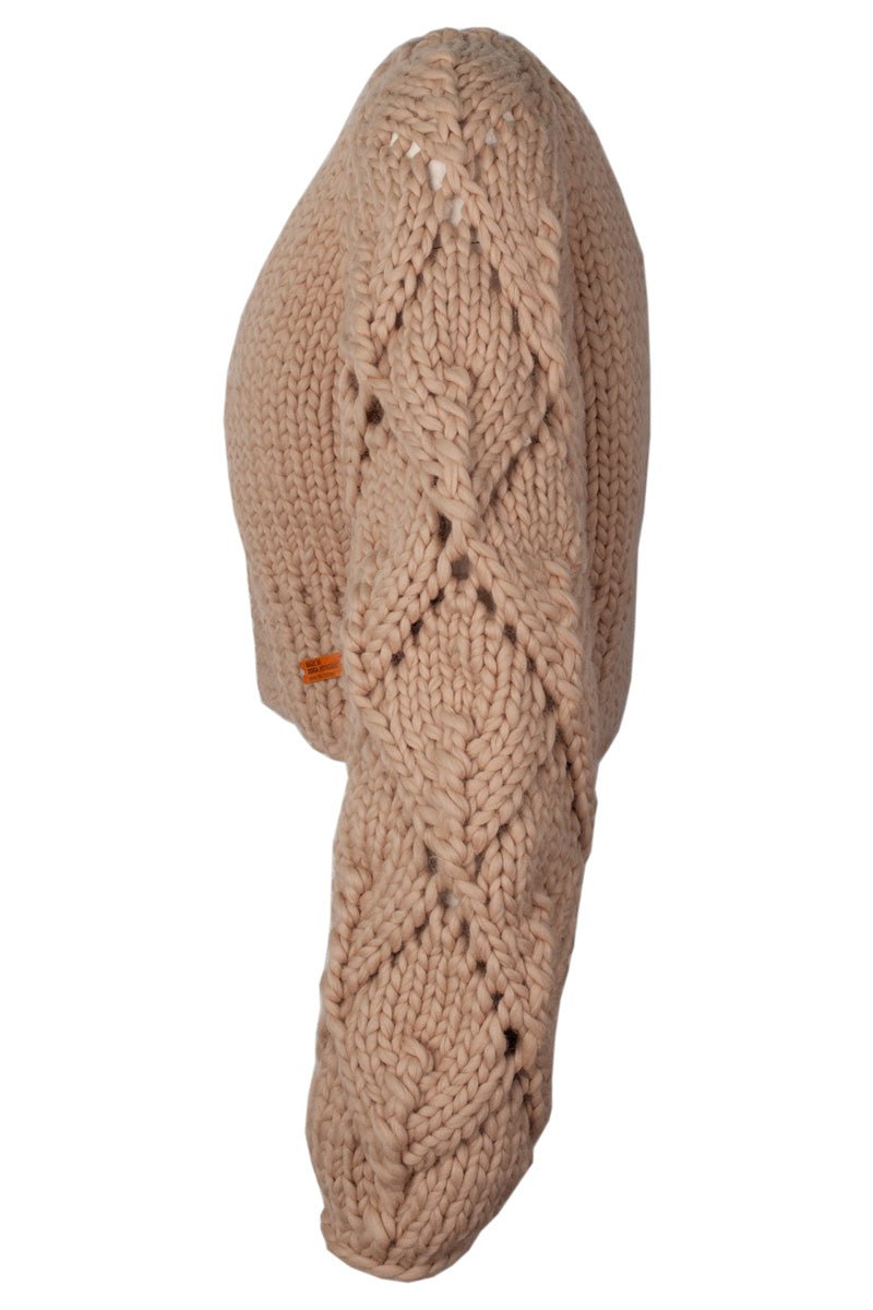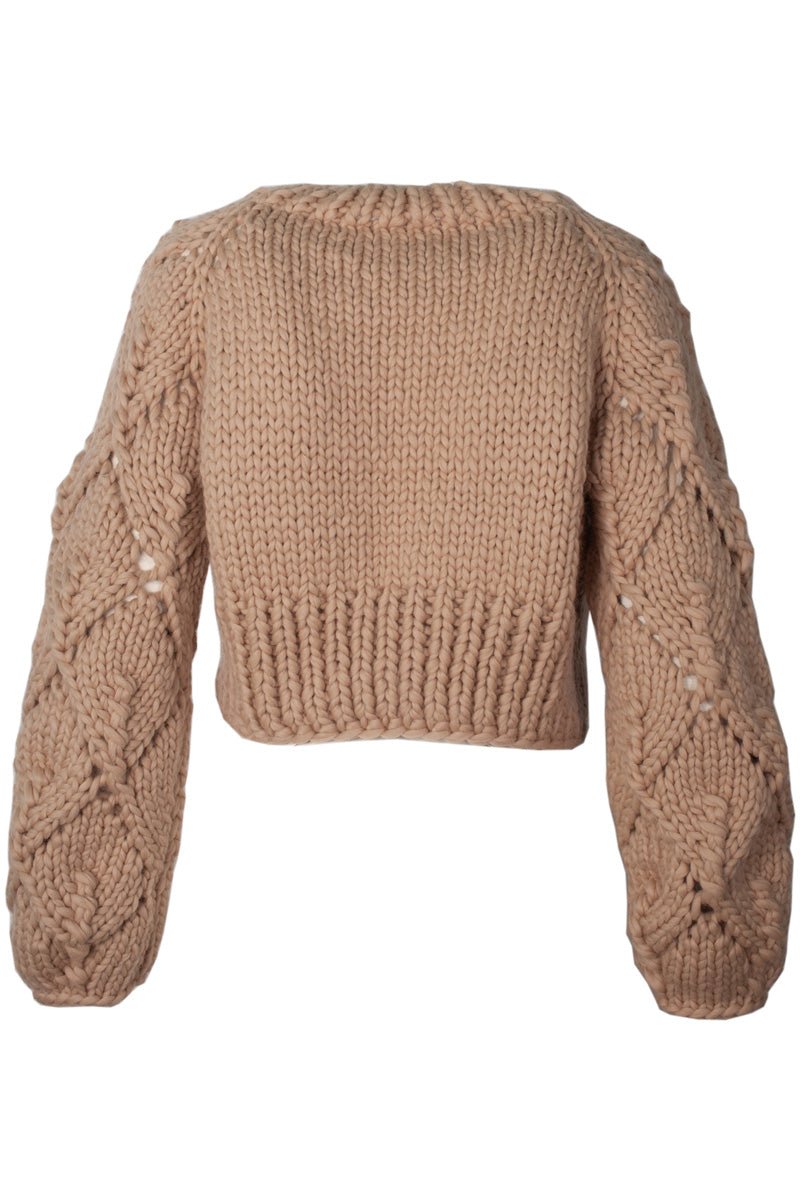 Spring is our handknitted merino wool (almost) cropped jacket. It plays well with high waisted jeans or your favorite skirt, it would even compliment an elegant dress on a formal night out. Its charm and versatility are due to its body hugging fit and chunky lace detailed sleeves, which add a modern and youthful twist to the garment without taking away from the ease and comfort of wearing it.