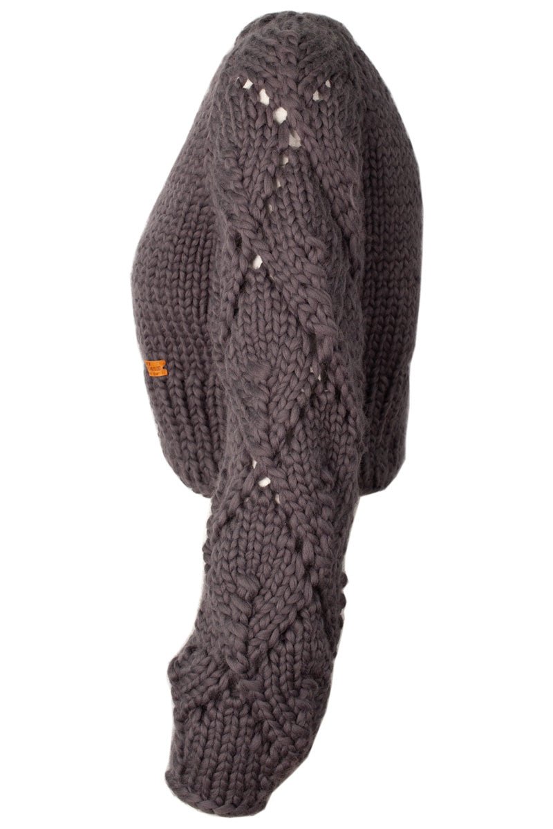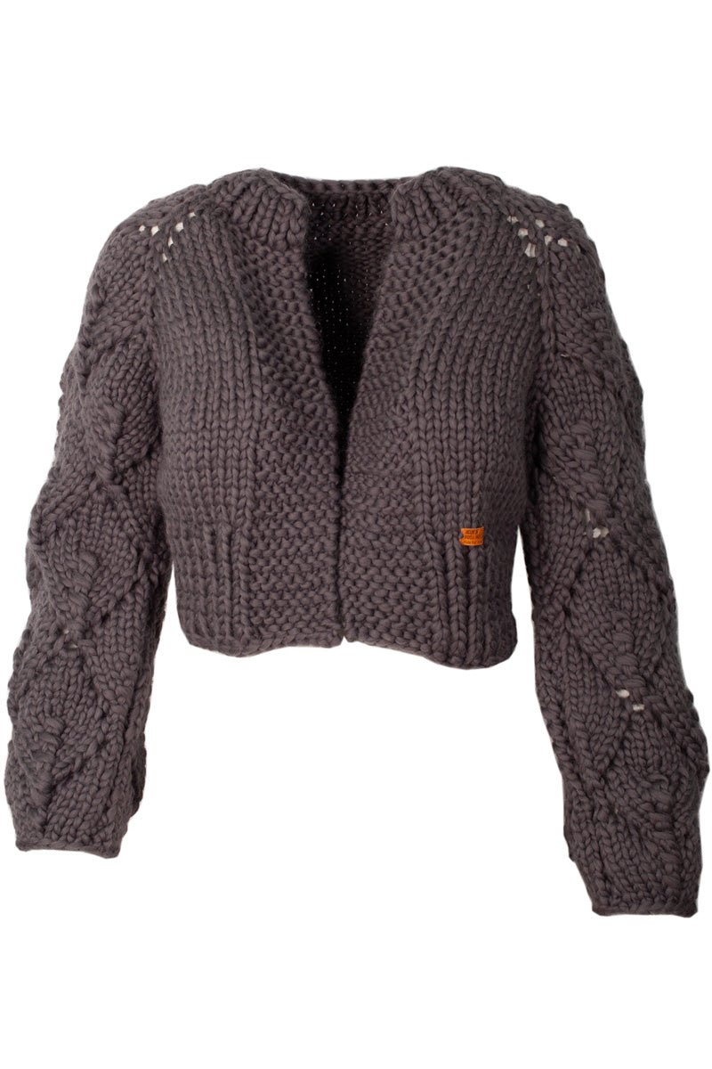 Spring is our handknitted merino wool (almost) cropped jacket. It plays well with high waisted jeans or your favorite skirt, it would even compliment an elegant dress on a formal night out. Its charm and versatility are due to its body hugging fit and chunky lace detailed sleeves, which add a modern and youthful twist to the garment without taking away from the ease and comfort of wearing it.