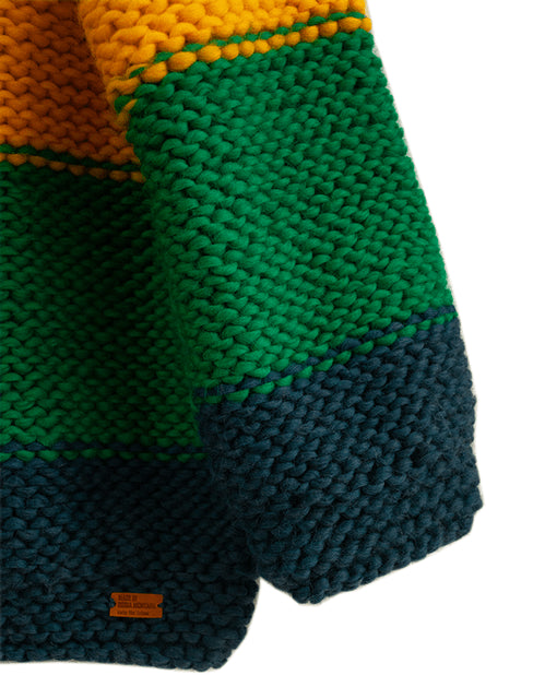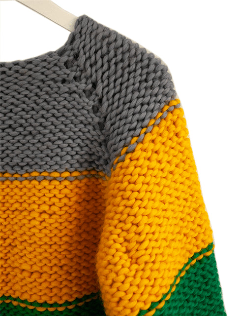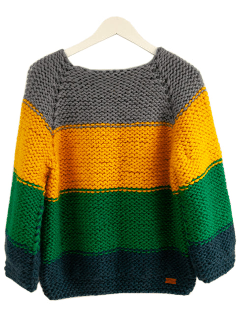 Hand knitted merino wool ladies sweater with a three quarter sleeve. Its slightly oversized cut brings home a truly cozy feel and the bold colour combinations give the wearer a happy and youthful look.